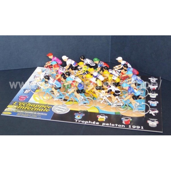 Trophy of 20 1/32 scale cycling rider figure. The jersey is made of a printed adhesive sticked on the rider back. They are displayed in a transparent plastic box.