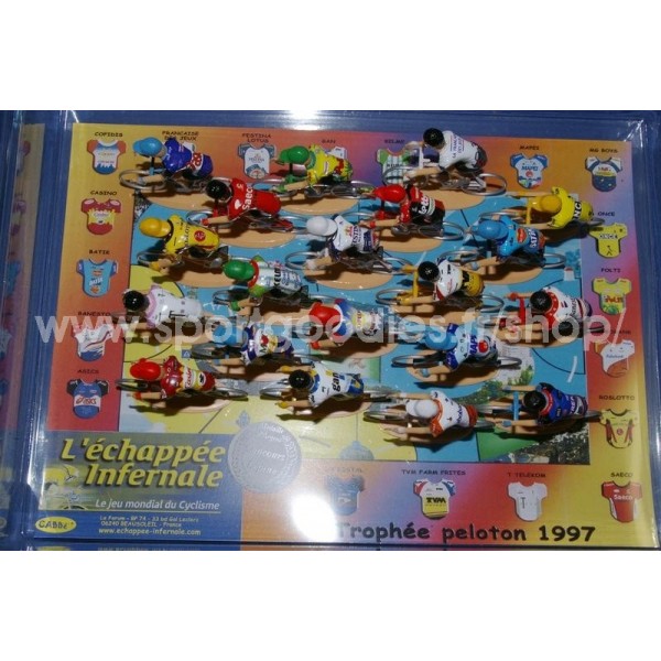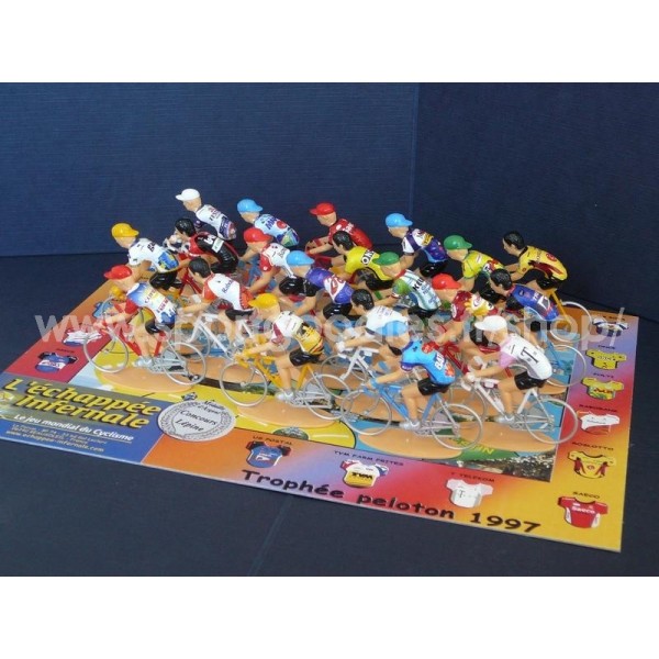 Trophy of 20 1/32 scale cycling rider figure. The jersey is made of a printed adhesive sticked on the rider back. They are displayed in a transparent plastic box.