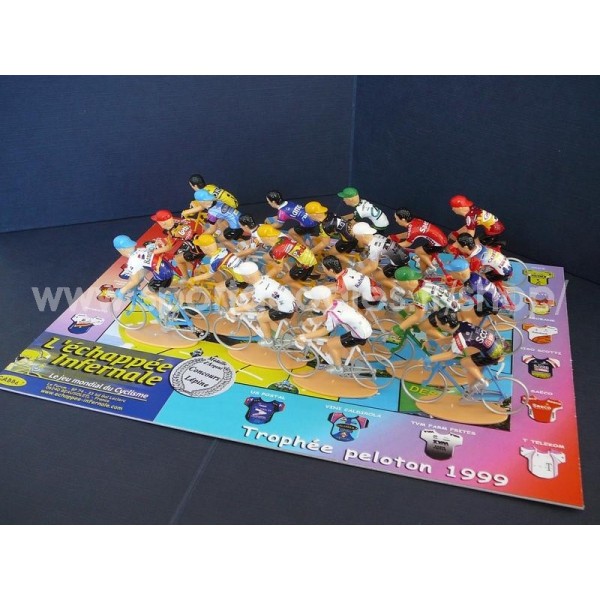 Trophy of 20 1/32 scale cycling rider figure. The jersey is made of a printed adhesive sticked on the rider back. They are displayed in a transparent plastic box.