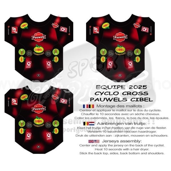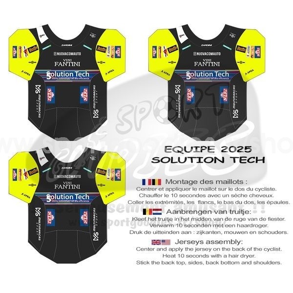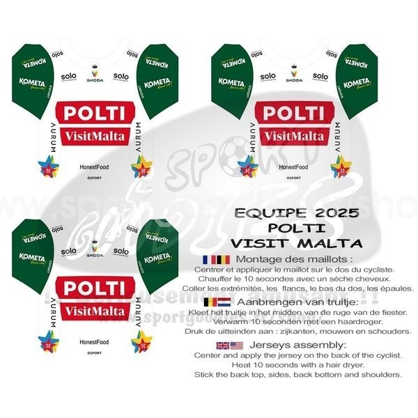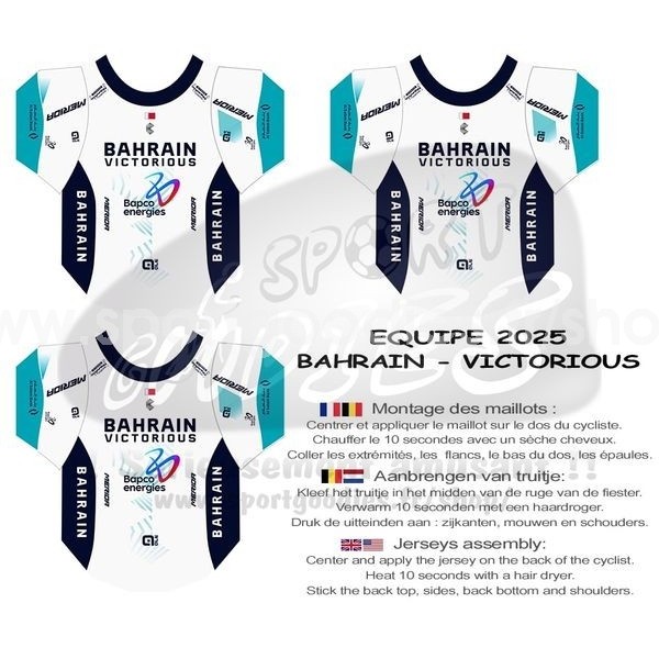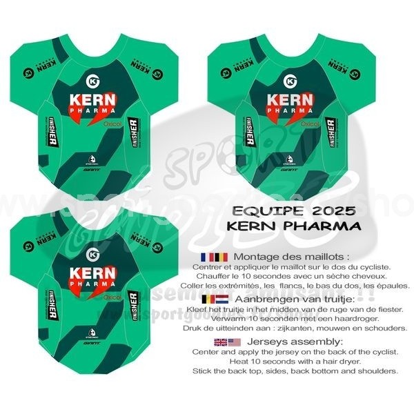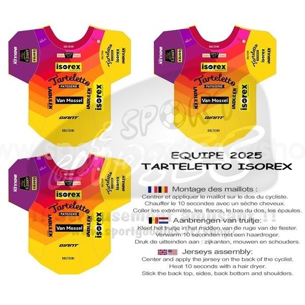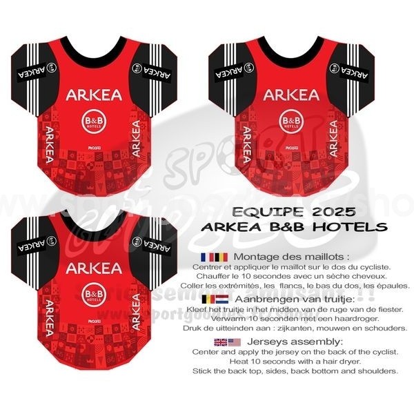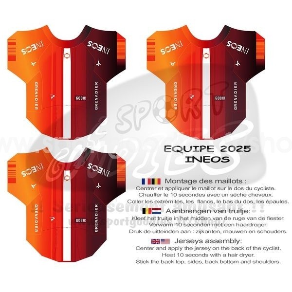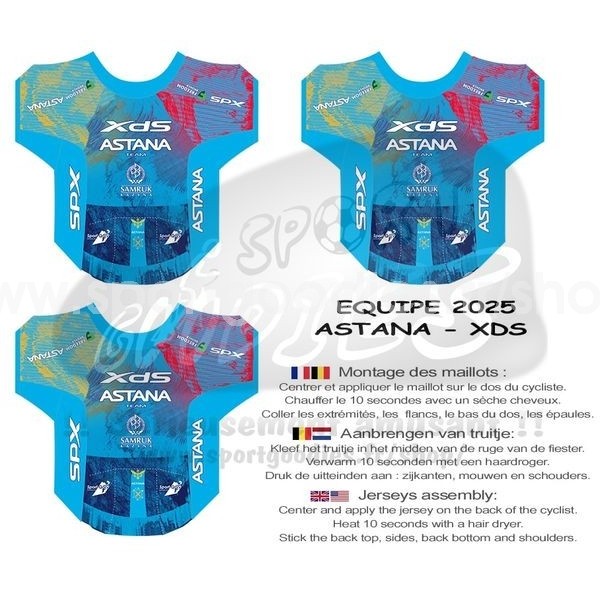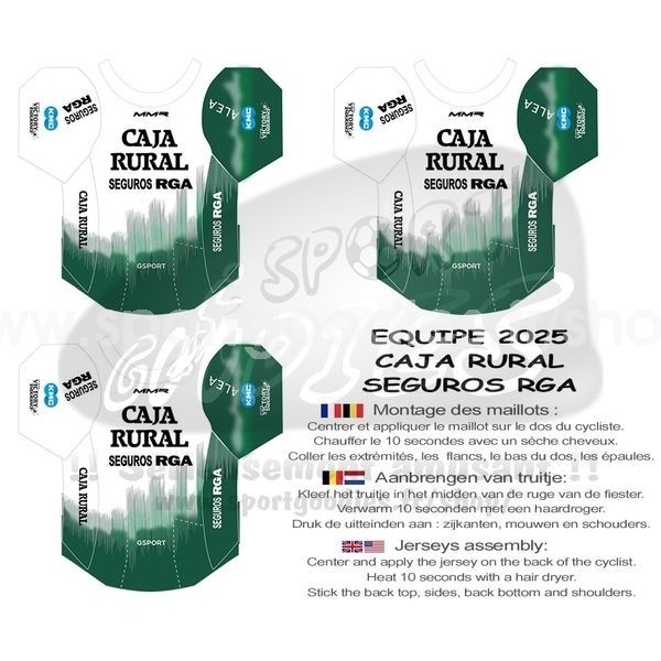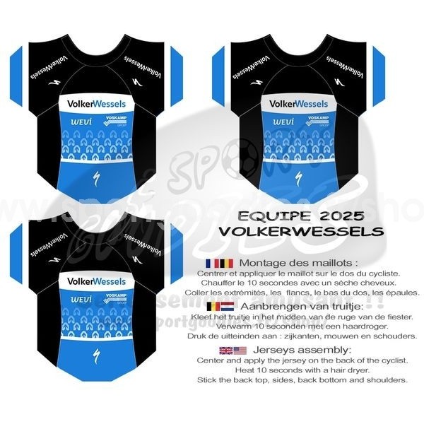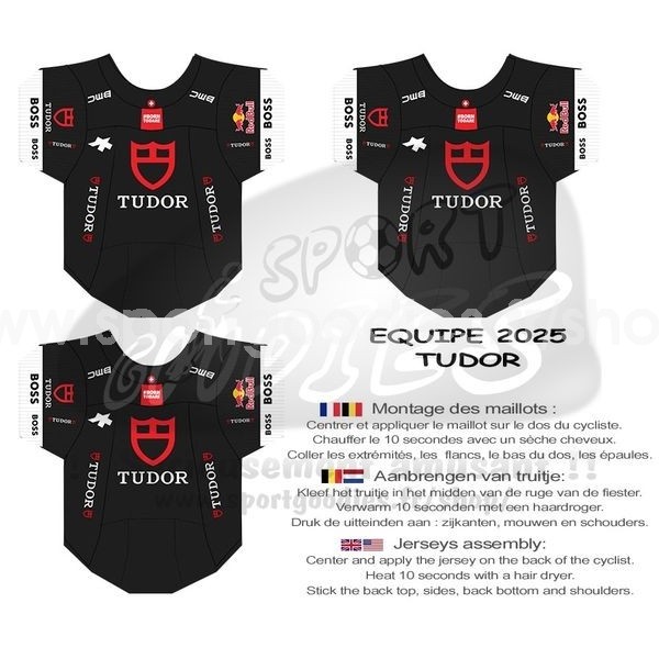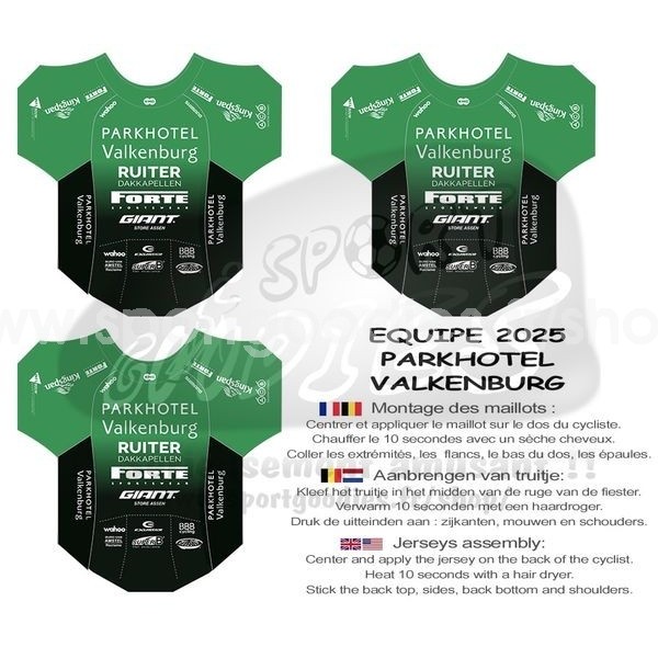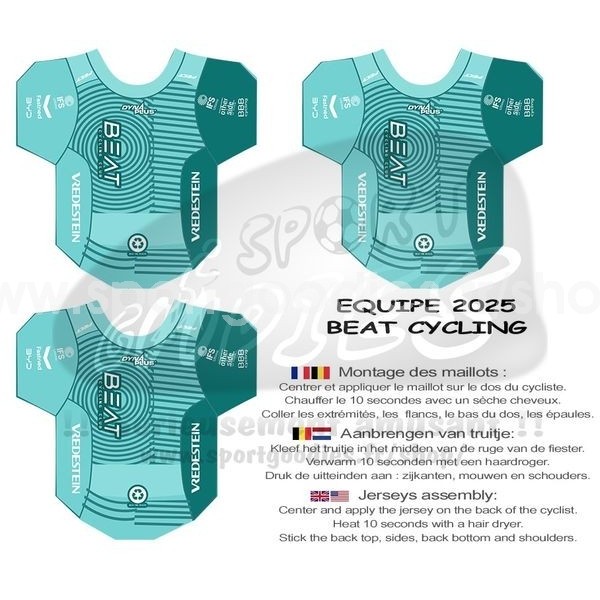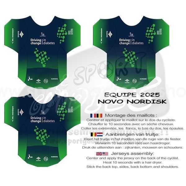 Jerseys assembly: Center and apply the jersey on the back of the cyclist. Heat 10 seconds with a hair dryer. Glue the ends, sides, lower back, shoulders