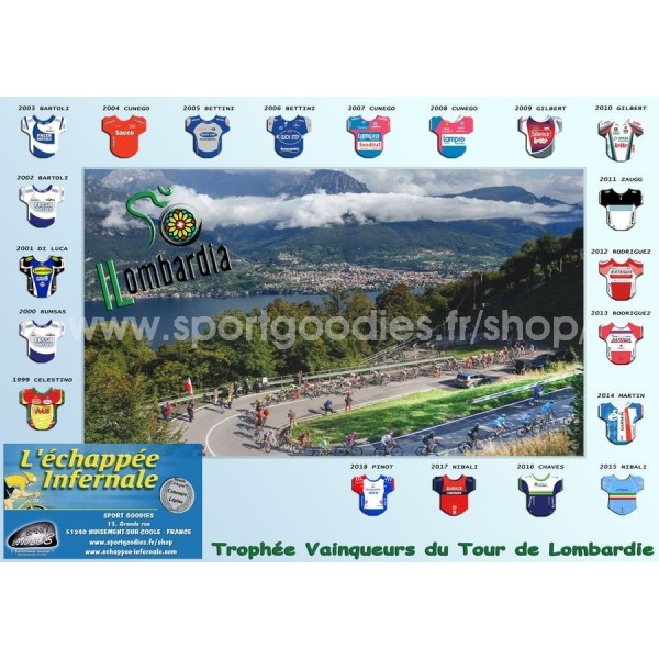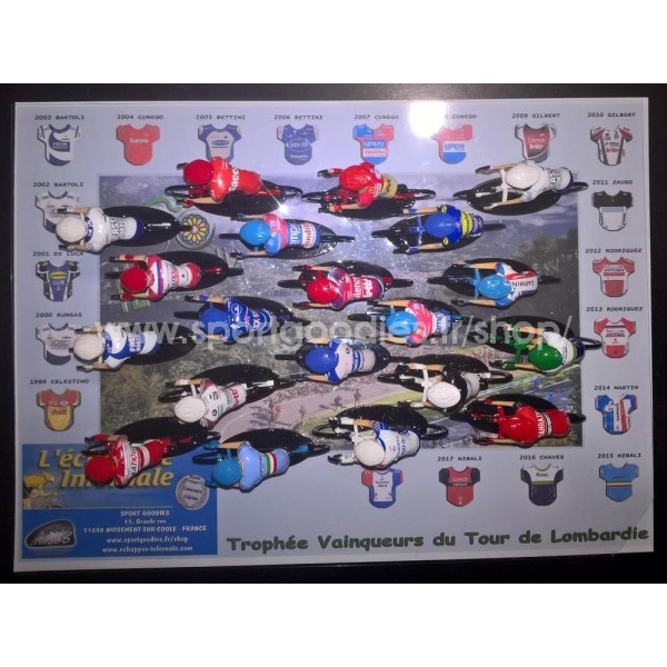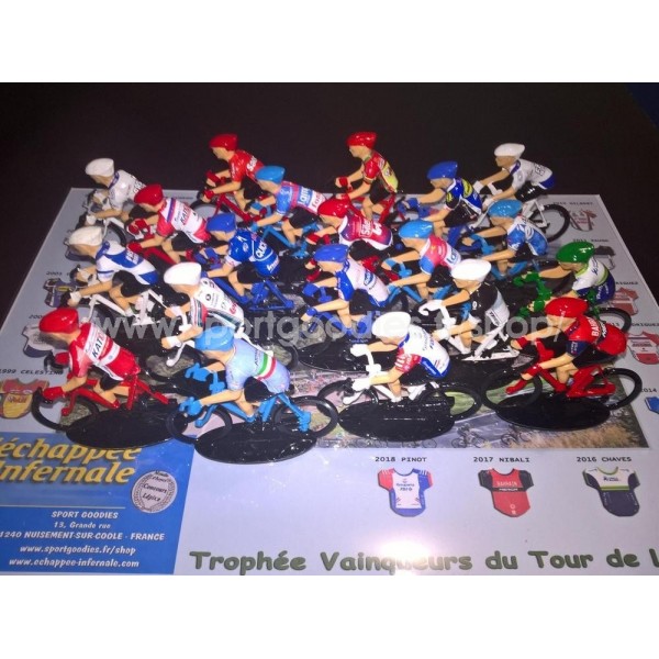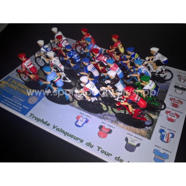 Trophy of 20 1/32 scale cycling rider figure representing the 20 last winners of the competition. The jersey is made of a printed adhesive sticked on the rider back. They are displayed in a transparent plastic box.