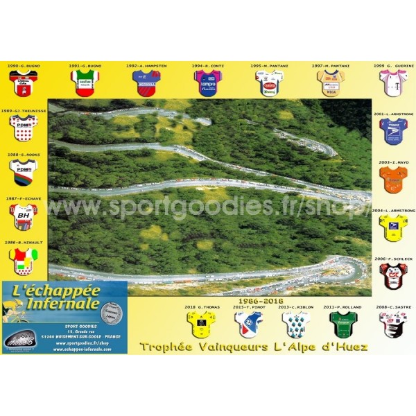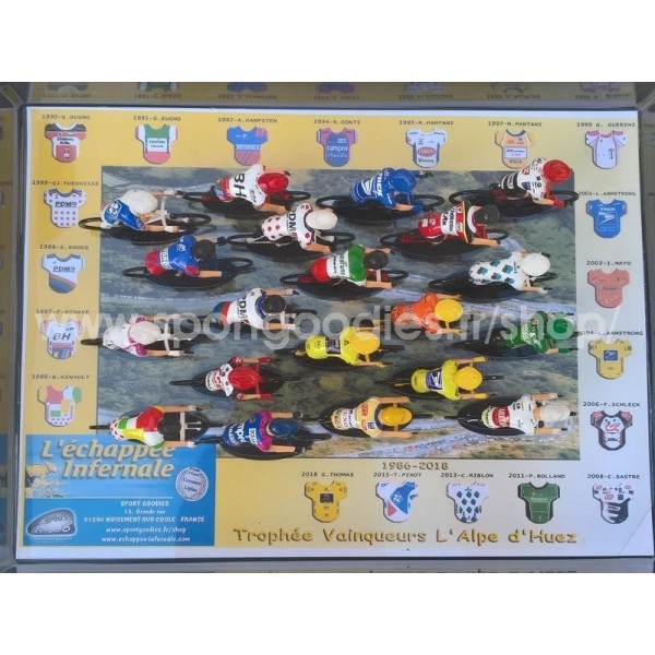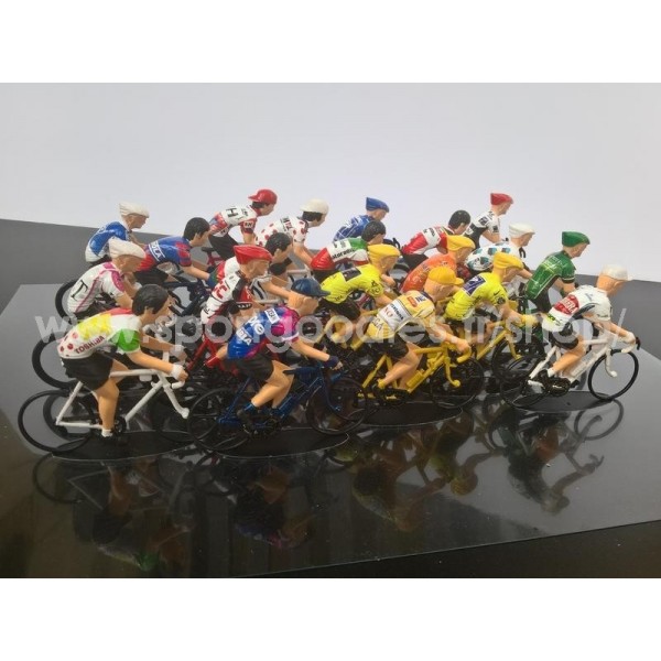 Trophy of 20 1/32 scale cycling rider figure. The jersey is made of a printed adhesive sticked on the rider back. They are displayed in a transparent plastic box.
