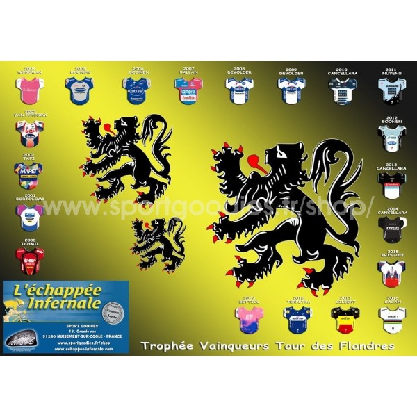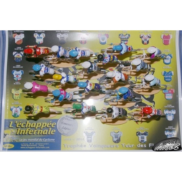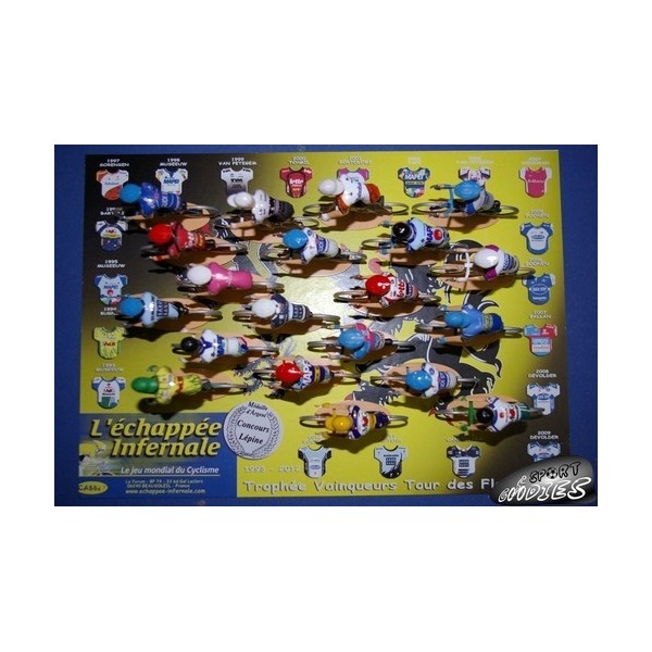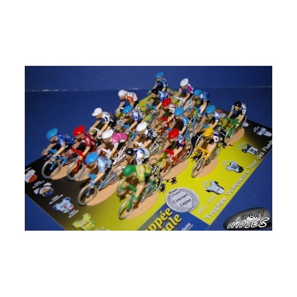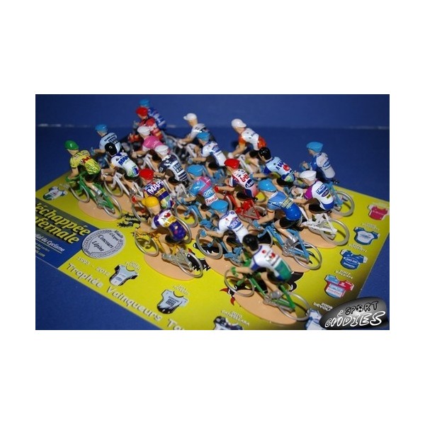 Trophy of 20 1/32 scale cycling rider figure. The jersey is made of a printed adhesive sticked on the rider back. They are displayed in a transparent plastic box.