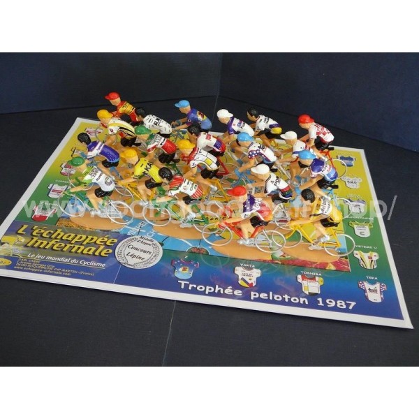 Trophy of 20 1/32 scale cycling rider figure. The jersey is made of a printed adhesive sticked on the rider back. They are displayed in a transparent plastic box.