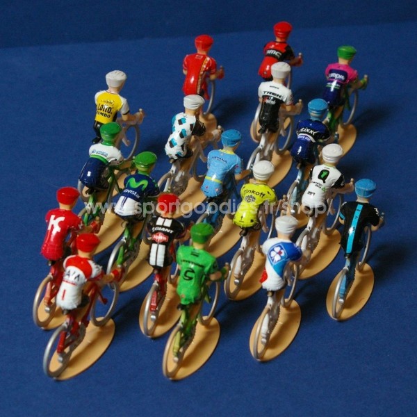 Trophy of 18 1/32 scale cycling rider figure. The jersey is made of a printed adhesive to be put on the rider back. They are displayed in a transparent plastic box.