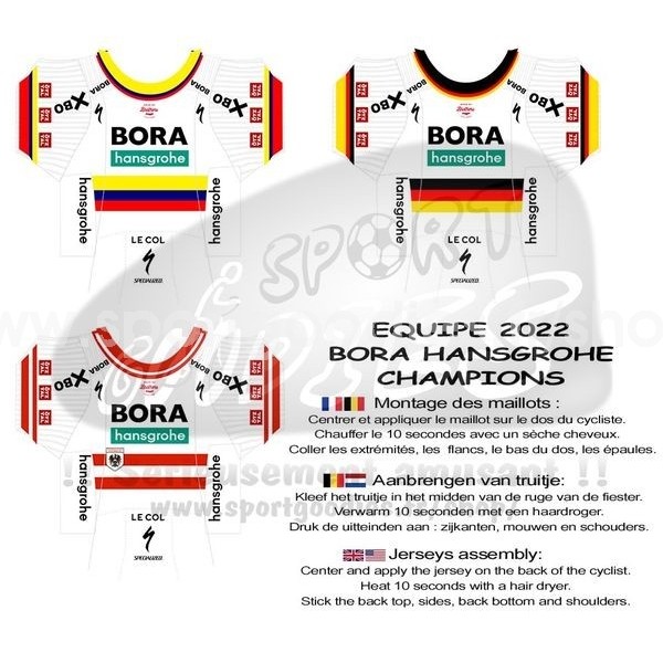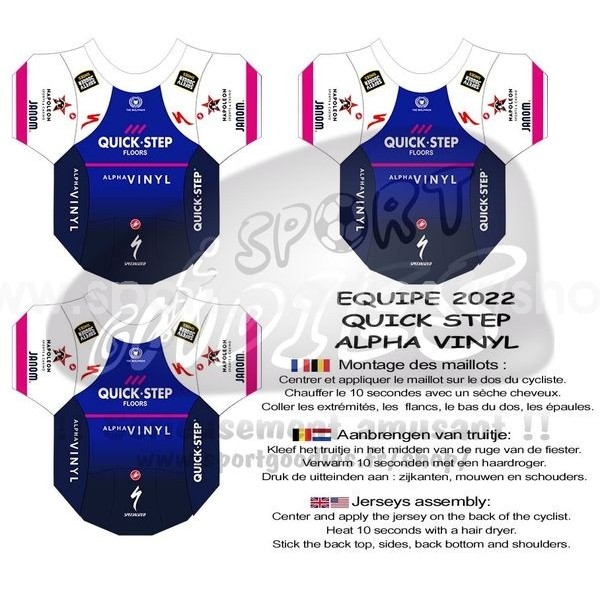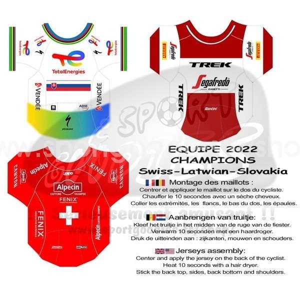 Jerseys assembly: Center and apply the jersey on the back of the cyclist. Heat 10 seconds with a hair dryer. Glue the ends, sides, lower back, shoulders.