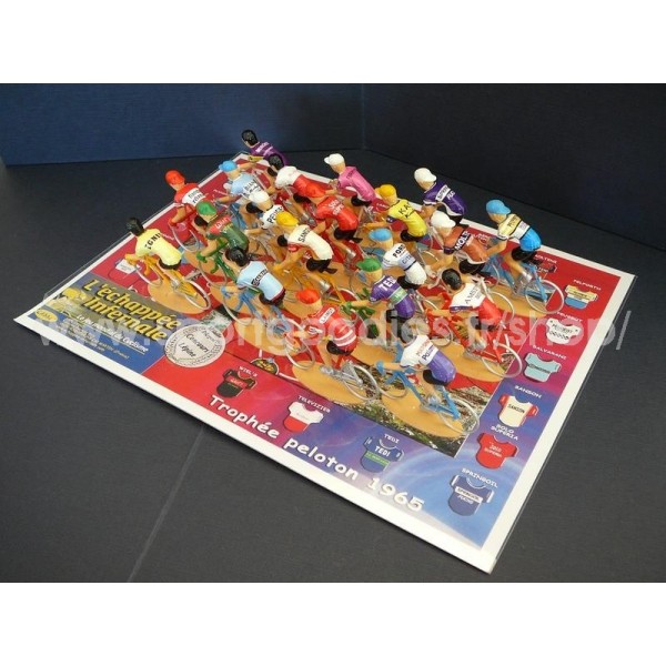 Trophée de 20 cyclistes miniatures. Les maillots sont représentés par des stickers posés dur le dos des coureurs. Présentés dans un blister transparent. Echelle 1/32 - Stickers à monter.