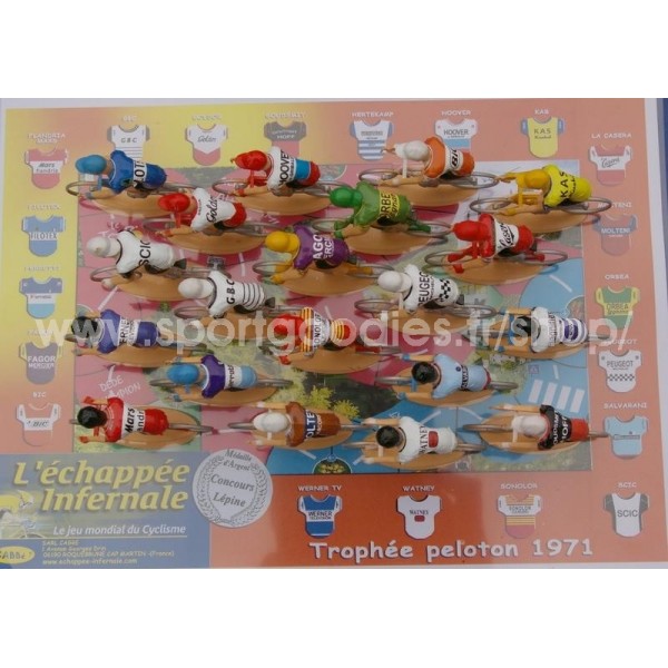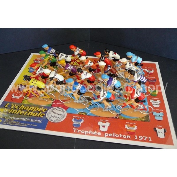 Trophée de 20 cyclistes miniatures. Les maillots sont représentés par des stickers posés dur le dos des coureurs. Présentés dans un blister transparent. Echelle 1/32