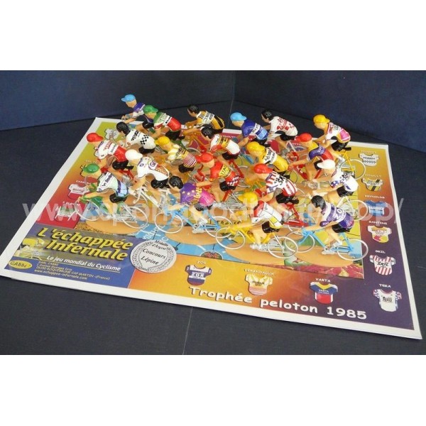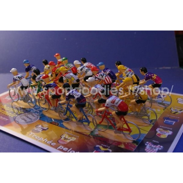 Trophée de 20 cyclistes miniatures. Les maillots sont représentés par des stickers posés dur le dos des coureurs. Présentés dans un blister transparent. Echelle 1/32