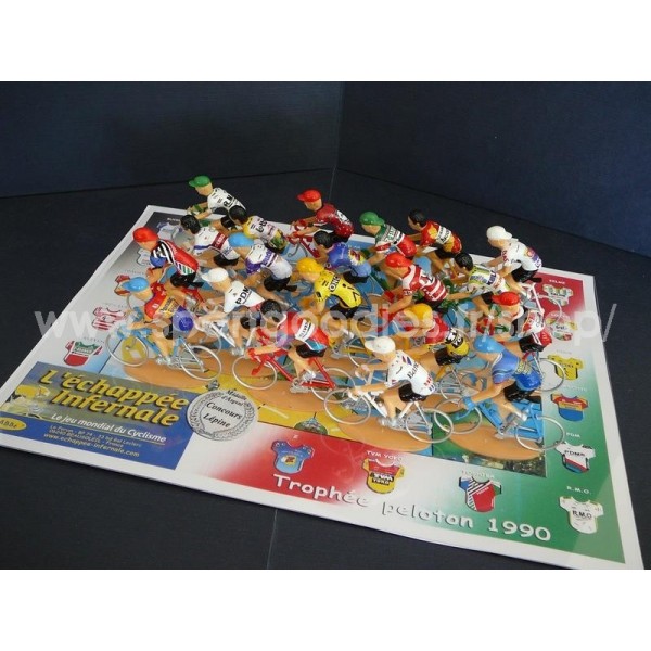 Trophée de 20 cyclistes miniatures. Les maillots sont représentés par des stickers posés dur le dos des coureurs. Présentés dans un blister transparent. Echelle 1/32