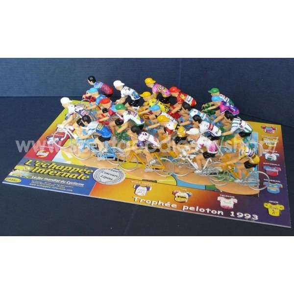 Trophée de 20 cyclistes miniatures. Les maillots sont représentés par des stickers posés dur le dos des coureurs. Présentés dans un blister transparent. Echelle 1/32