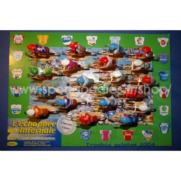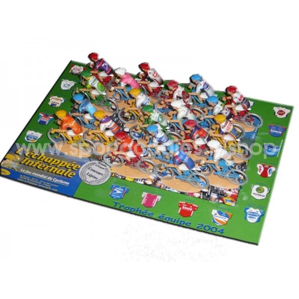Trophée de 20 cyclistes miniatures. Les maillots sont représentés par des stickers posés dur le dos des coureurs. Présentés dans un blister transparent. Echelle 1/32