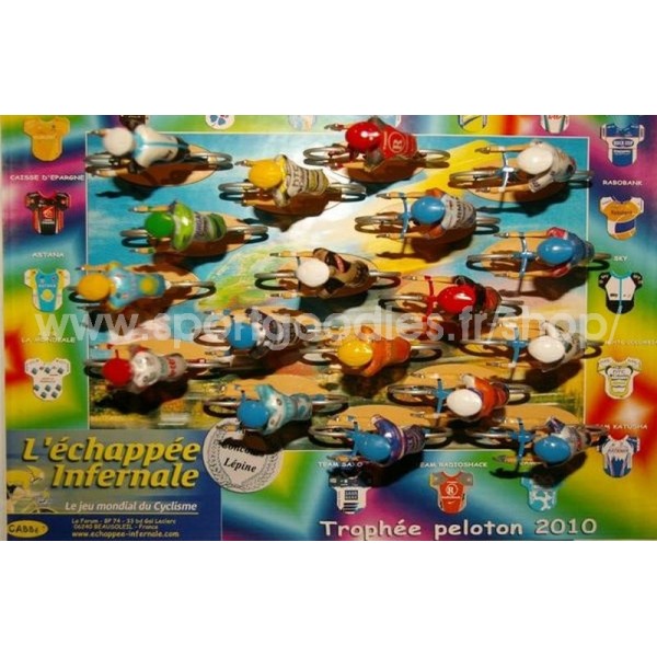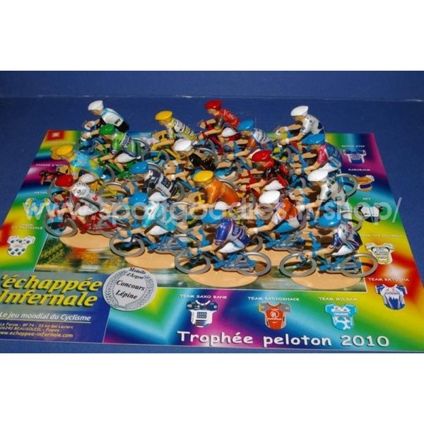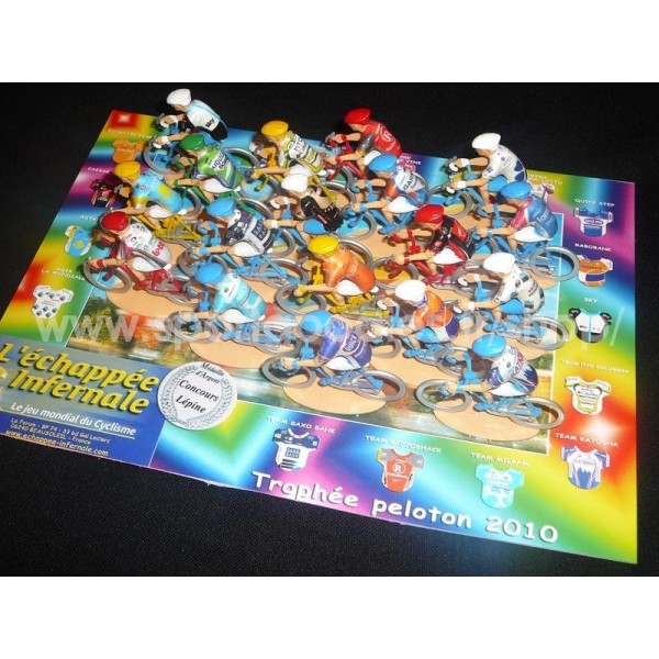 Trophée de 20 cyclistes miniatures. Les maillots sont représentés par des stickers posés dur le dos des coureurs. Présentés dans un blister transparent. Echelle 1/32