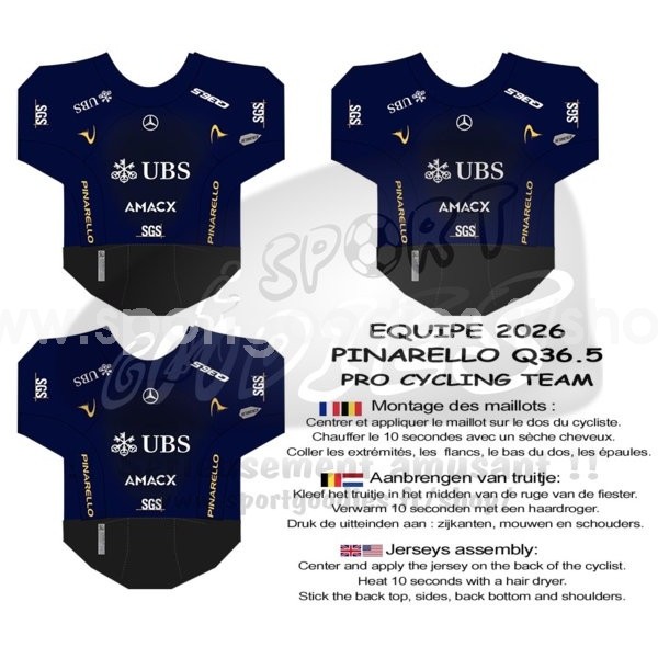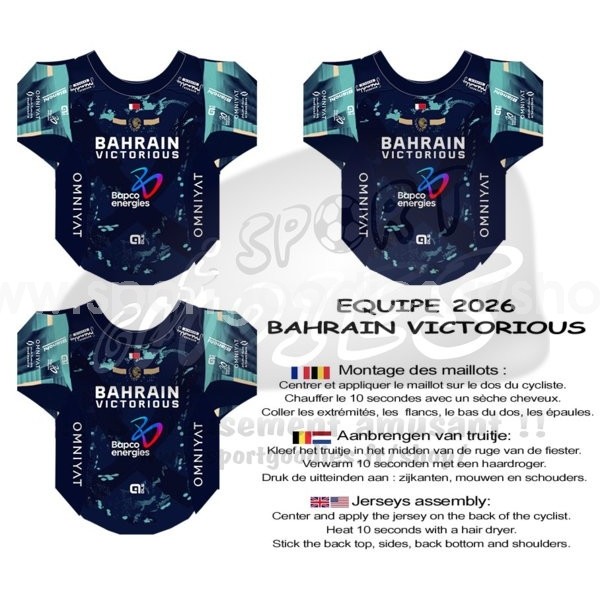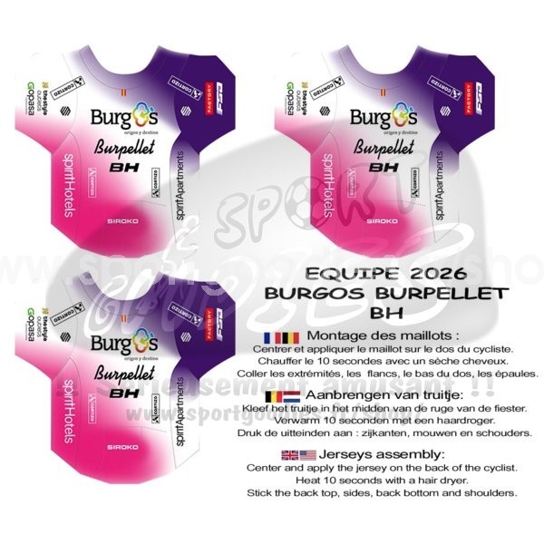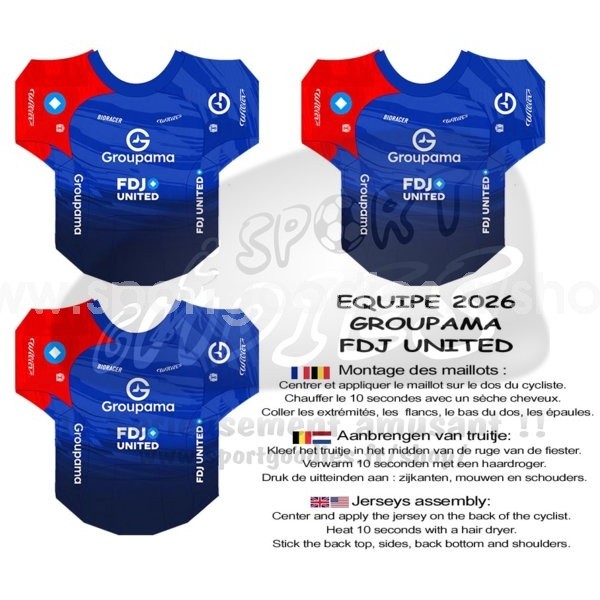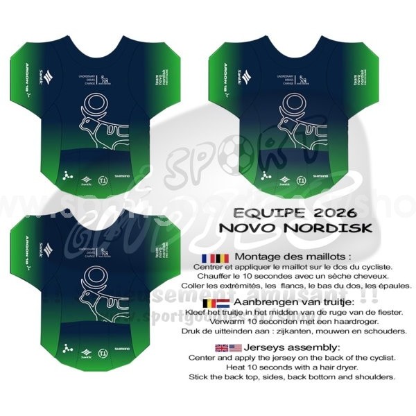 Montage des maillots: Centrer et appliquer le maillot sur le dos du cycliste. Chauffer le 10 secondes avec un sèche cheveux. Coller les extrémités, les flancs, le bas du dos, les épaules.