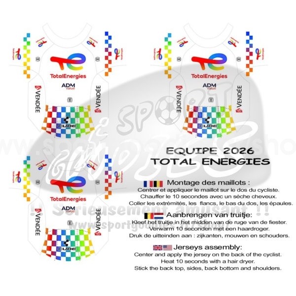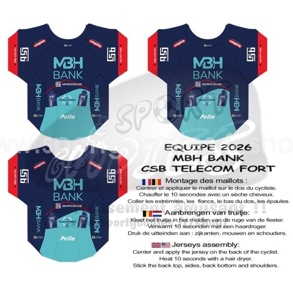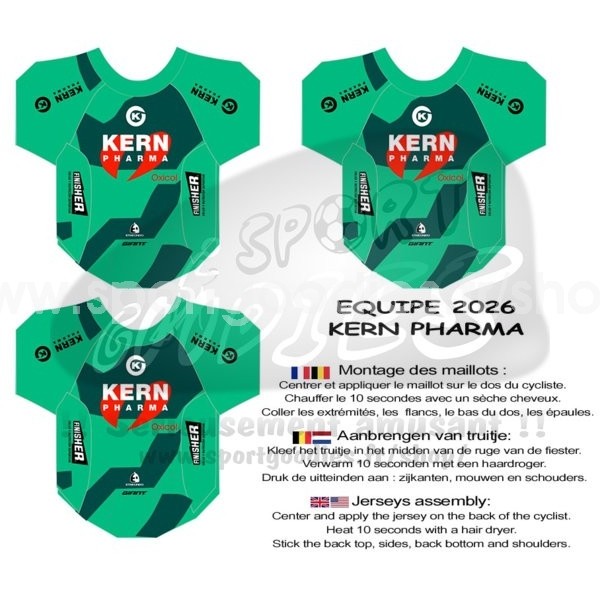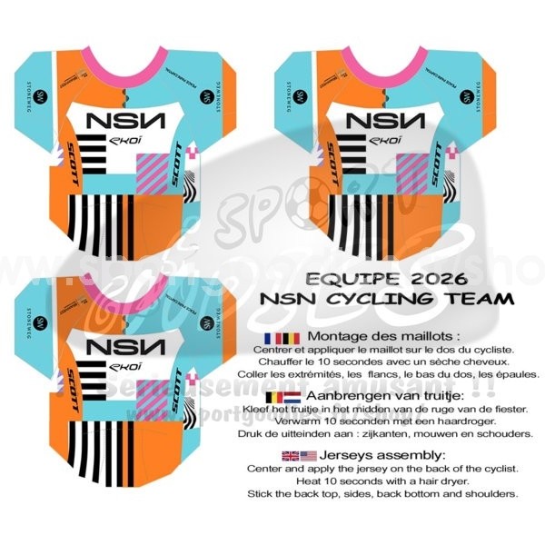 Montage des maillots: Centrer et appliquer le maillot sur le dos du cycliste. Chauffer le 10 secondes avec un sèche cheveux. Coller les extrémités, les flancs, le bas du dos, les épaules.