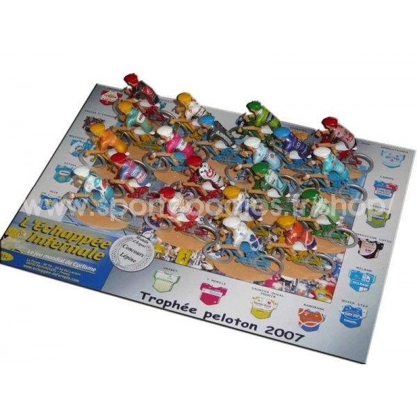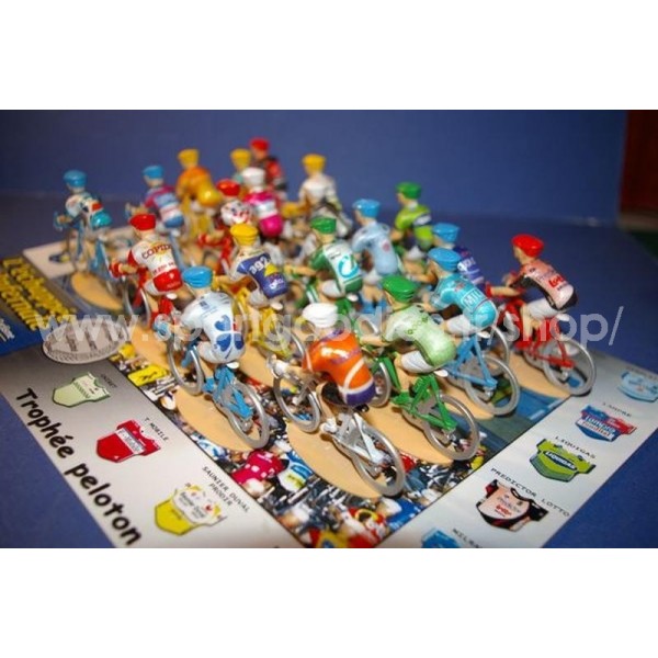 Trofeo di 20 corridori ciclisti a scala 1/32. Le maglie sono degli adhesivi stampati e incollati sul dorso dei corridorei. Presentati in una scattola trasparente