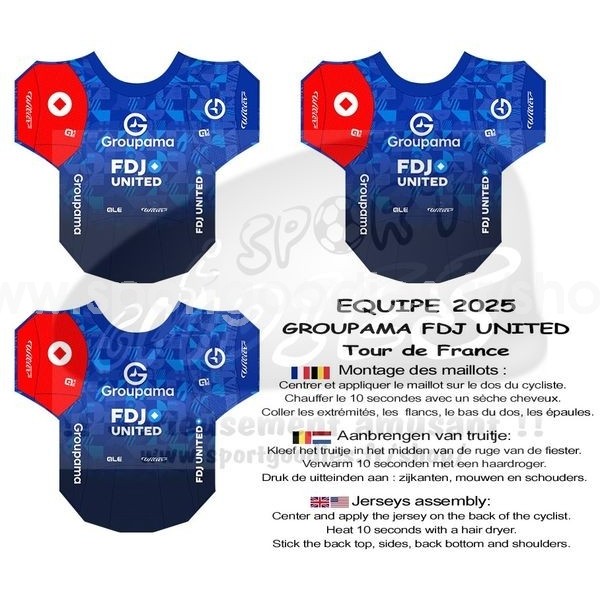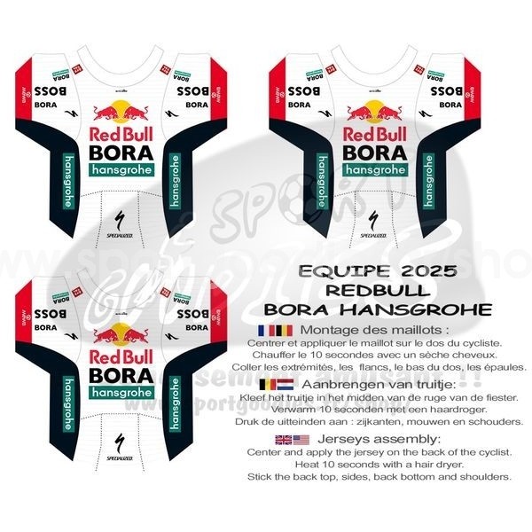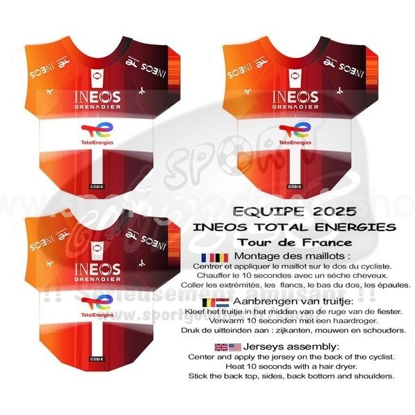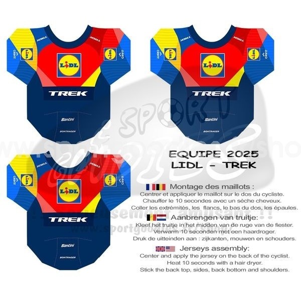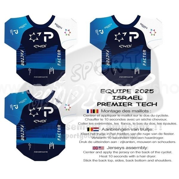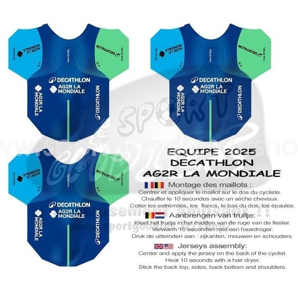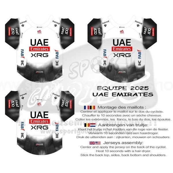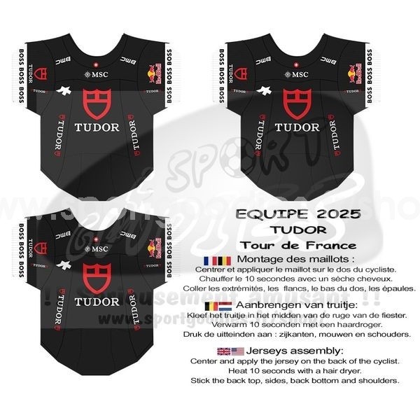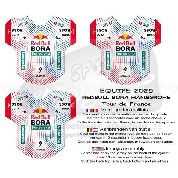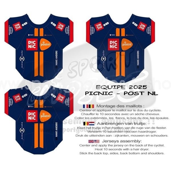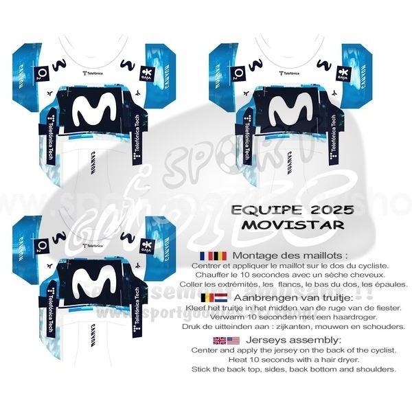 Montaggio delle maglie: Centrare ed applicare la maglietta sulla schiena del corridore. Scaldare 10 secondi con un asciugacapelli. Incollare le estremità del lato, parte bassa della schiena, delle spalle.