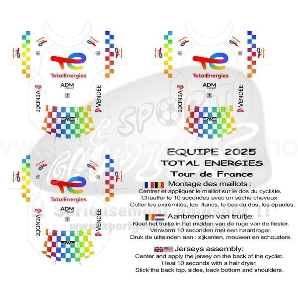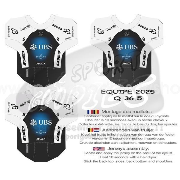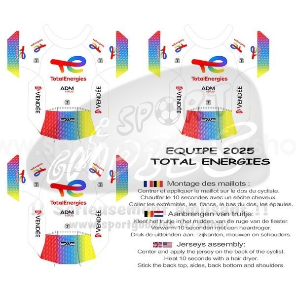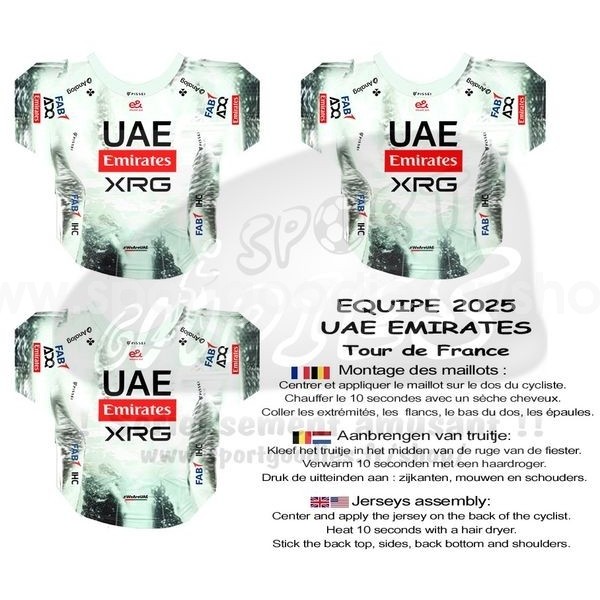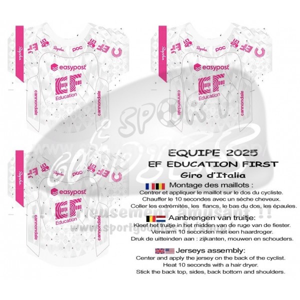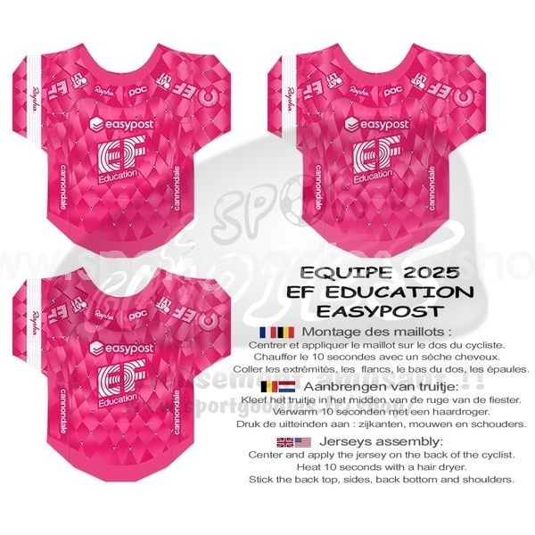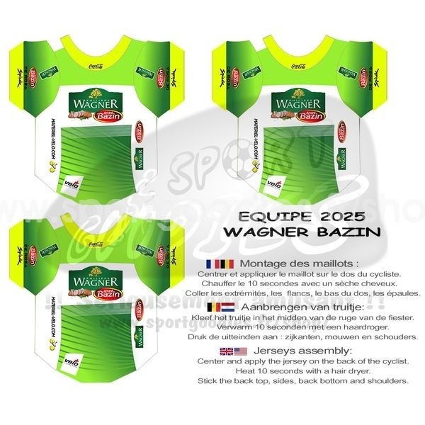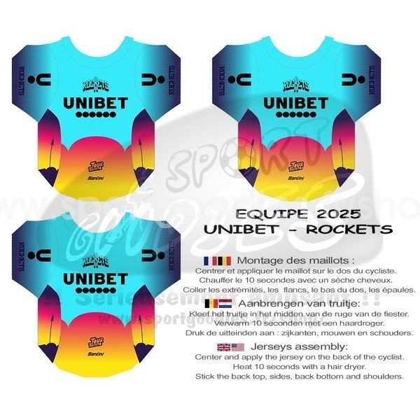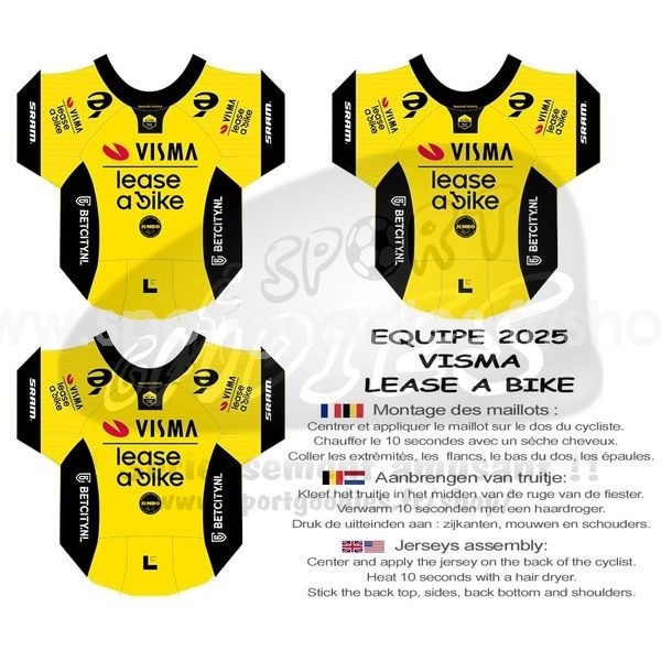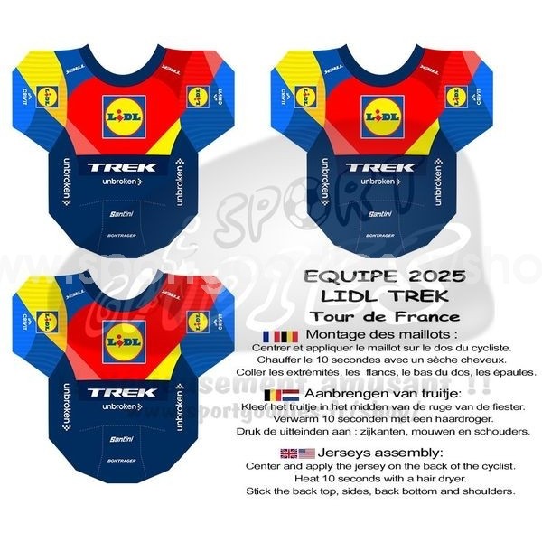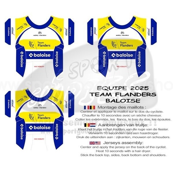 Montaggio delle maglie: Centrare ed applicare la maglietta sulla schiena del corridore. Scaldare 10 secondi con un asciugacapelli. Incollare le estremità del lato, parte bassa della schiena, delle spalle.