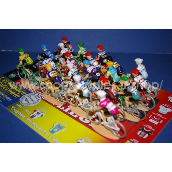 Trofeo di 20 corridori ciclisti a scala 1/32. Le maglie sono degli adhesivi stampati e incollati sul dorso dei corridorei. Presentati in una scattola trasparente